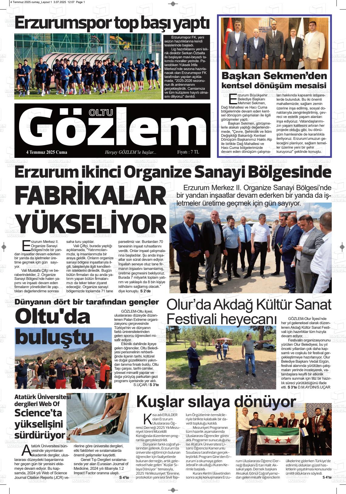 Erzurum Yerel Gazeteleri 02 Ekim 2025, Perşembe Günü Manşeti